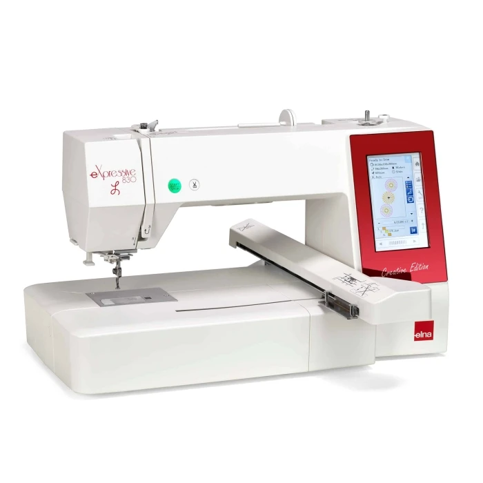 La Máquina de Bordar Elna Expressive 830L cuenta con una pantalla táctil LCD que hace que el trabajo sea muy sencillo. Podemos bordar letras y dibujos, además cuenta con puerto USB, para que seamos nosotros los que añadamos bordados a la máquina. Este modelo de ELNA es muy completa en cuanto accesorios. Área de bordado de 20×36 cm. Incluye 4 Bastidores: Bastidor SQ14b ( 140 mm x 140 mm), Bastidor RE20b (140 mm x 200 mm), Bastidor SQ20b (200 mm x 200 mm) y Bastidor RE236b (200 mm x 360mm). Además incluye una mesa de trabajo más ancha.